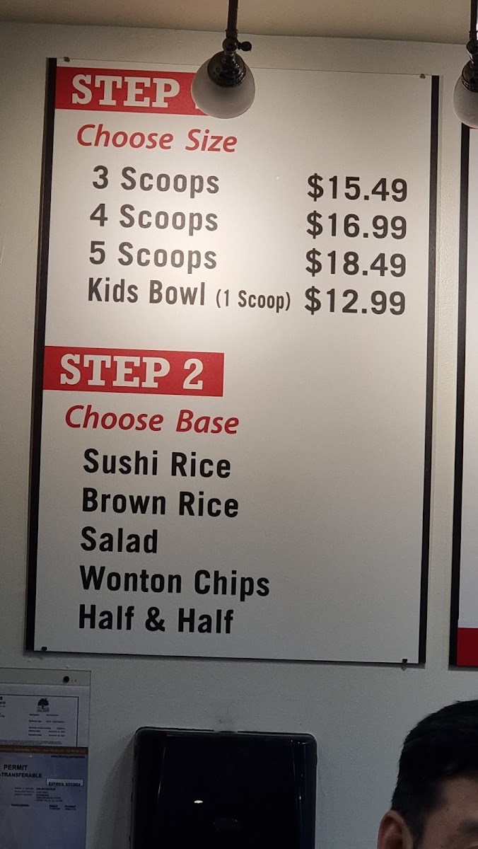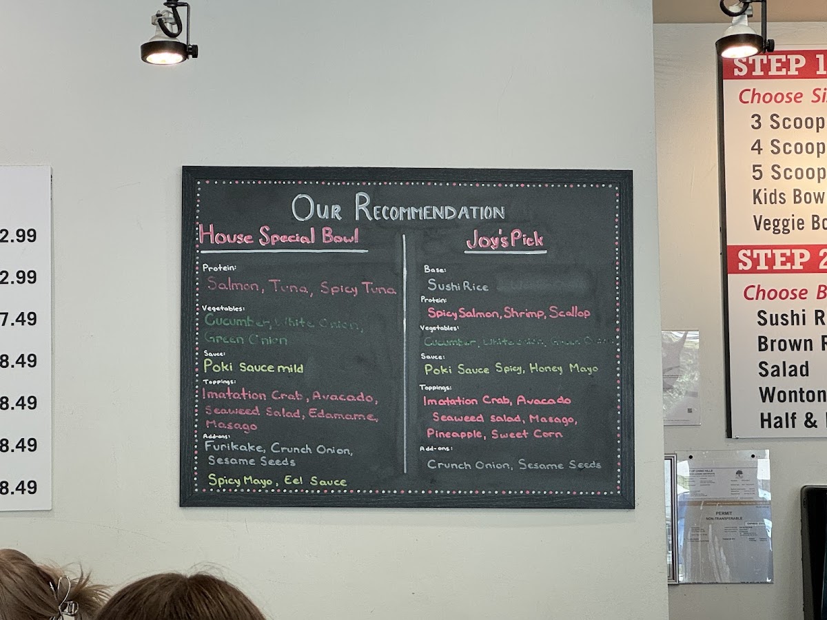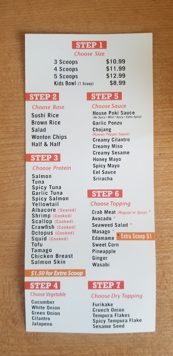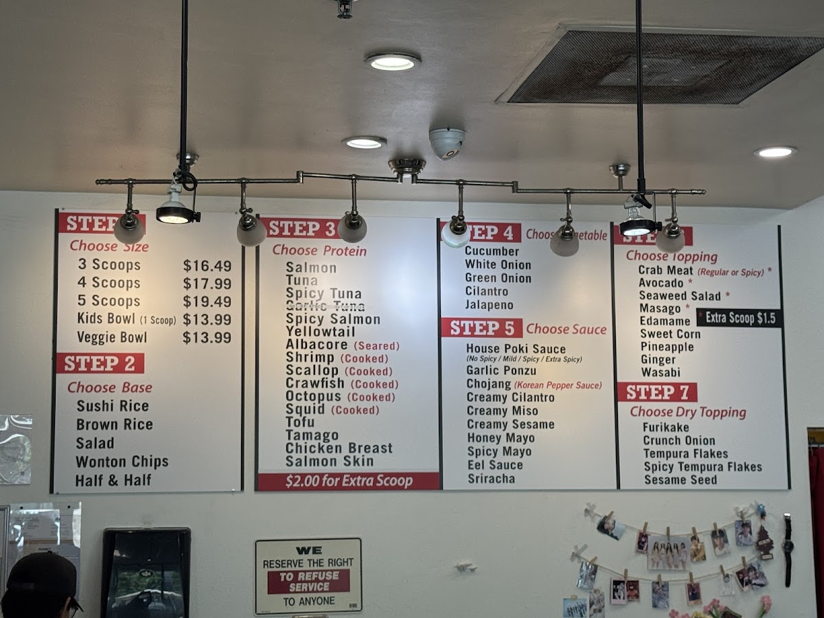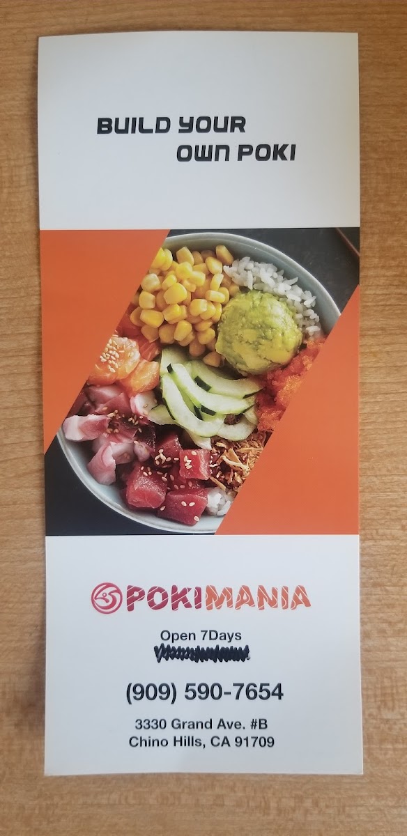 The menu at Pokimania focuses primarily on poke bowls, featuring a variety of fresh ingredients combined with signature dressings such as sesame dressing and a house poki sauce. Customers can expect a selection centered around poke, typically served over rice, with options for different types of seafood and complementary sauces. The menu is structured to offer customizable bowls, allowing diners to choose from various protein options and flavor combinations.